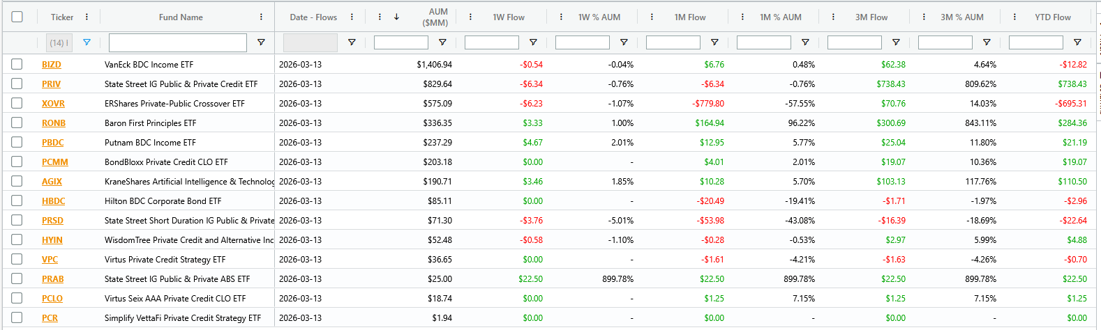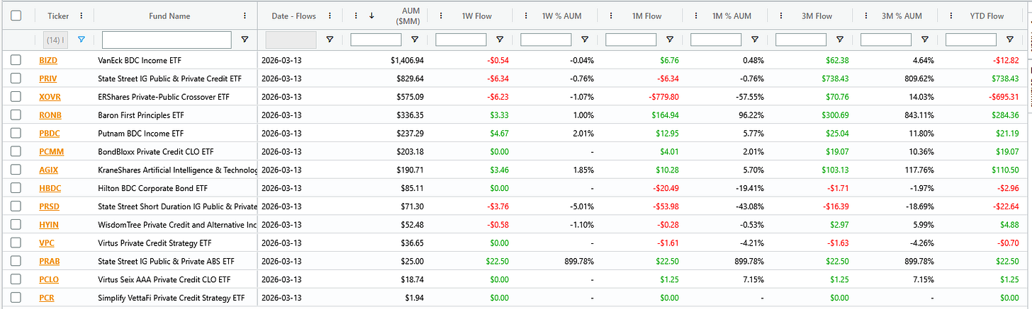 I’m got a screen setup in ETF Action to track all these private asset ETFs. We can see that PRAB is now listed but otherwise not a lot of flows moving around in there.