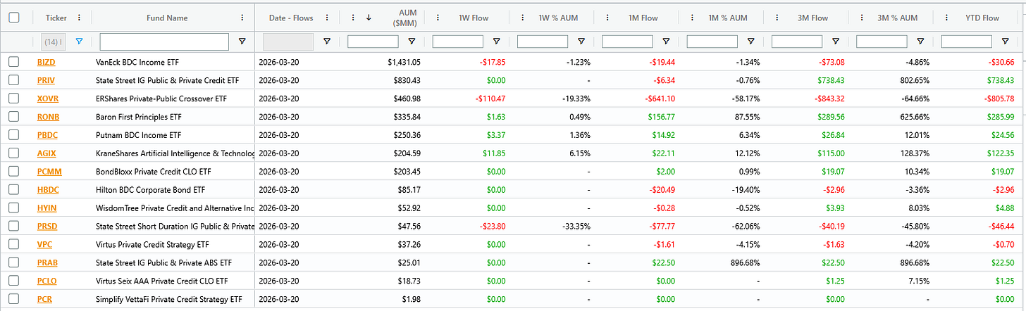 Aside from the flow into PRIV last month, I see minimal demand for funds with private credit assets. We can see the flows coming out of both BIZD and PRSD while the rest sit flat. Pardon my not reporting more on PRAB but I think a total of 1,000 shares have traded since launch (including my share!). I don’t see some juggarnaut of flows coming down the pipeline. If anything the monstrous amount of negative coverage surrounding the AI sector of the middle market lending is likely pushing investors away!